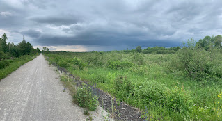 If you know the trail around Orillia, you'll likely recall that it's heavily treed for a good bit as you meander eastward, at least until you pass the 15th line. As I was crossing, I was startled by a rolling clap of thunder, prompting a scan to my right, and what do I spy but the darkest, nastiest, OMG'est cloud I've seen in a while. Ever the optimist, I reasoned the the trail was going almost due East and the cloud with its accompanying rain was much further north, likely hammering the hamlet of Edgar right then.I couldn't have been more wrong!
